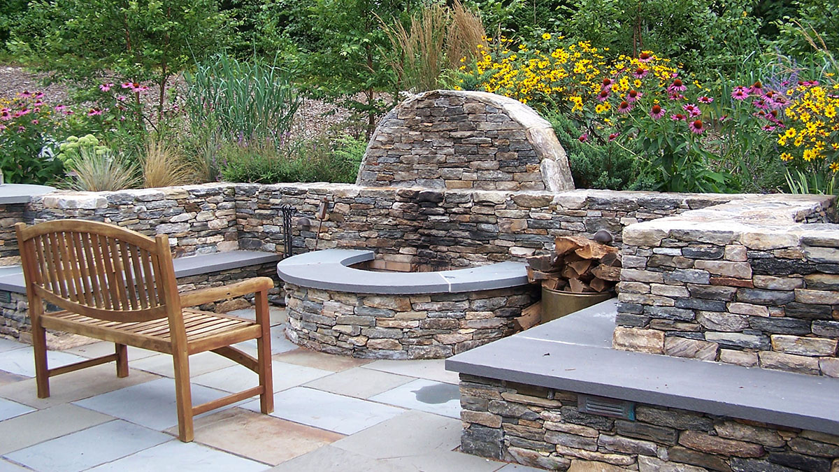 Project Description: This family had a wide range of needs that had to be accommodated in a long and narrow space. Arcs were used throughout the design as a unifying element. Native stone echoes the existing ledge on the property and ties into the natural surroundings. Stainless steel appliances (36” grill, cabinets, and cocktail station) complete the kitchen area. The pool is moderate in size and fits perfectly into the space. A future pool house will add one more space for relaxation. Plantings (mostly native) are being incorporated into the project in phases.